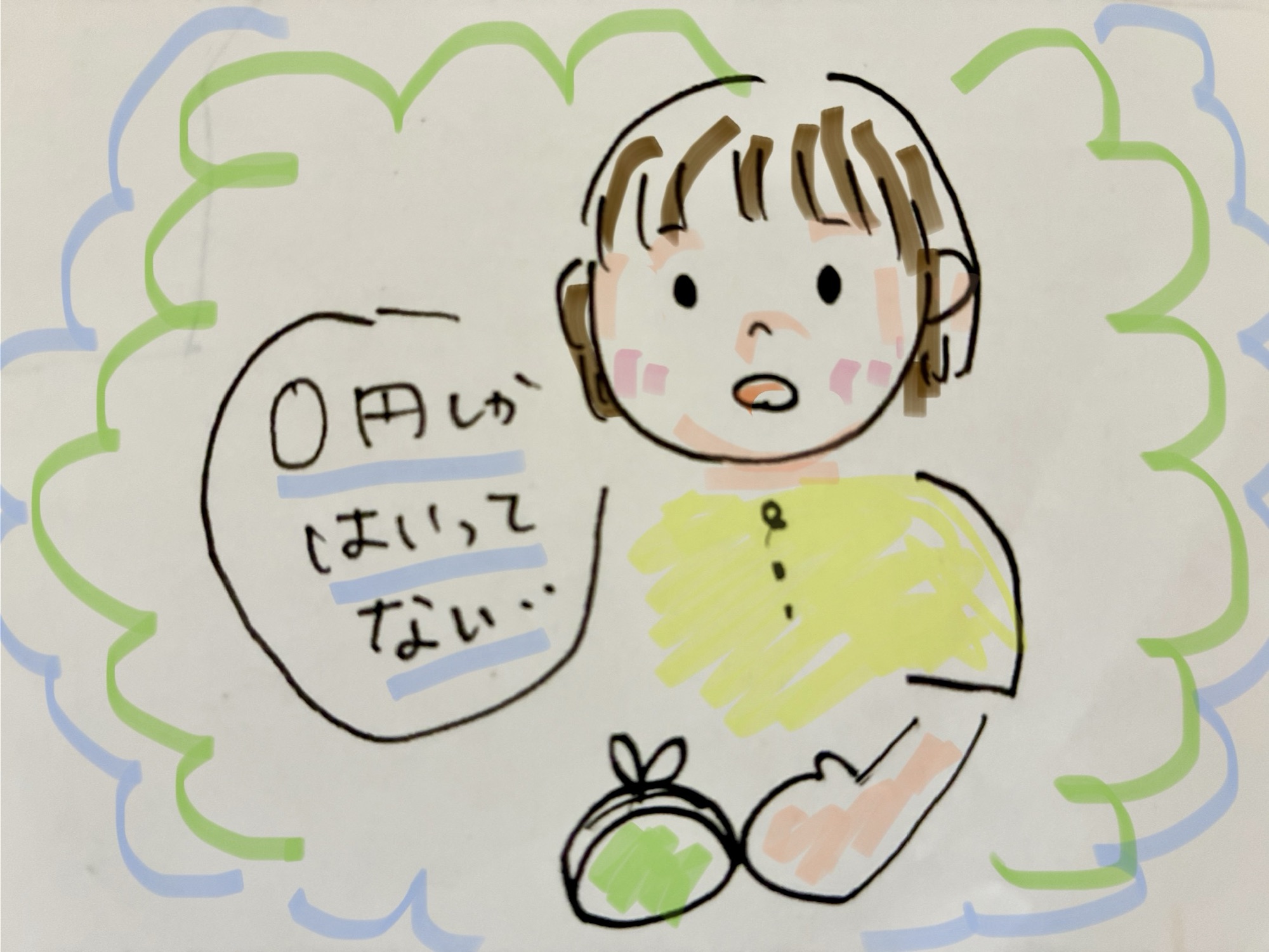 イラストは、お財布をあけて言った次男の一言がかわいかったので描きました☺︎